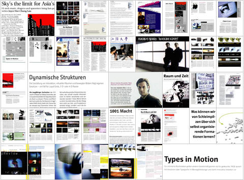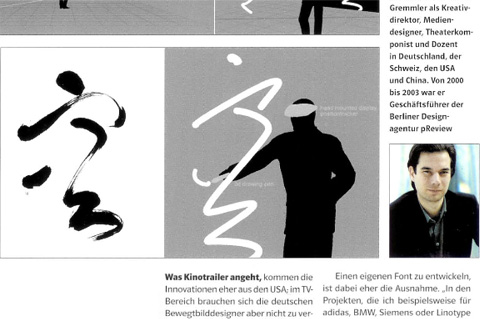_ Interviews & Reviews C5, Culture Club, Design Report, Designer´s Bookshelf, designNET, Page, Milk, Novum, Oriental Daily, Paperideas, STU University Press _ _ Grids for the Dynamic Image review Designer´s Bookshelf, US [...] Tobias Gremmler have broken away from the shackles of traditional design and embarked on a stunning new venture in designing grids. It’s a comprehensive exploration of the moving image and the grid systems that support it, with invaluable discussions of space, volume, and motion. Besides, the book’s design and production is so exciting to look at, some might love it and never read a single word! It’s that stunning! (Designer´s Bookshelf) _ Breaking the Wall between Virtuality and Reality designNET, Korea What interests us is not just what is doable, but what is thinkable. Drama, dynamics and rhythm emerge from the inner structures of the varios media. In our cultural projects we can go beyond the digital; we can break the rules, transfer them to other media and develop hybrid forms. We call this “structure tracking”, e.g. the transfer of the music into a moving image. [...] Anyone who wants to enable a brand or company identity to be experienced consistently over a range of media has to have more than just a theoretical knowlege of the design rules and the parameters of print, TV, internet and mobile devices - they basically need to have perfected their abilities in this are.[...] can´t properly develop a design without bringing in scientific knowlege and strategic requirements. (designNET) _ 1001 Macht - Interactive Storytelling PAGE, Deutschland [...] In Museen und Theatern sowie bei Events gewinnen interaktive Erzählformen an Akzeptanz - erweitern sie doch erheblich das Spektrum an technischen, wissenschaftlichen oder fantastischen Dingen, die man darstellen kann. “Die Gäste sind von solchen Möglichkeiten in der Regel begeistert und immer mehr Veranstalter setzen auf solche Präsentationen”, erklärt Tobias Gremmler, der als freier Designer unter anderem derartige mediale Inszenierungen entwickelt. Für das Musical “A Hong Kong Odysee” beispielsweise hat Tobias Gremmler eine interaktive Bühnenlandschaft entworfen, bei der Schauspieler, Sänger und zunächst auch das Publikum mit virtuellen Charakteren interagieren. “Dabei muss man teilweise die Aktionen von mehreren hundert Anwendern zusammenbringen” erklärt Gremmler die Besonderheiten des Interactive Storytelling im Raum. (PAGE) _ |