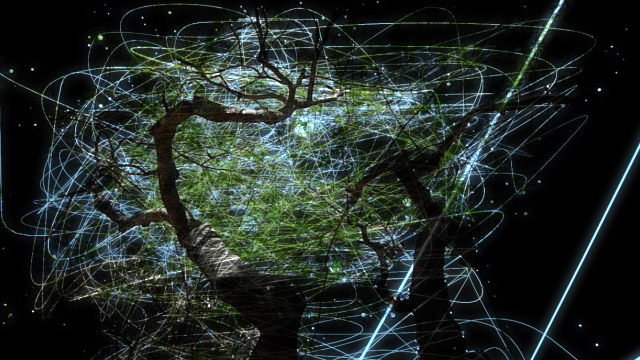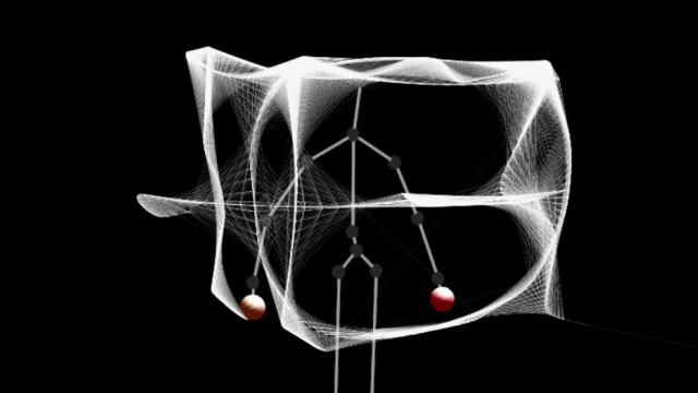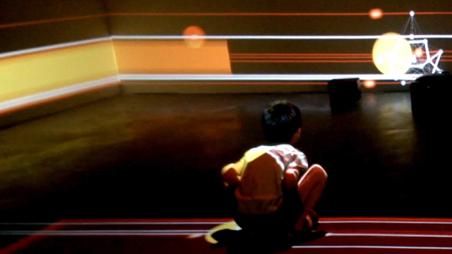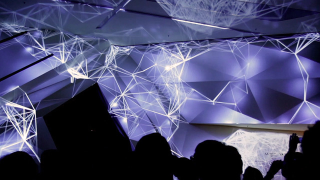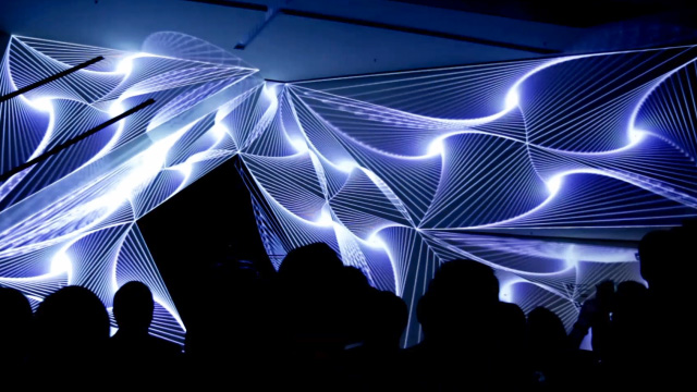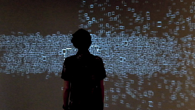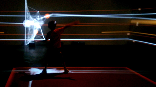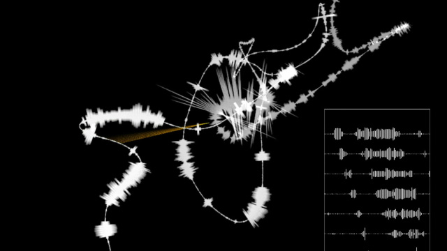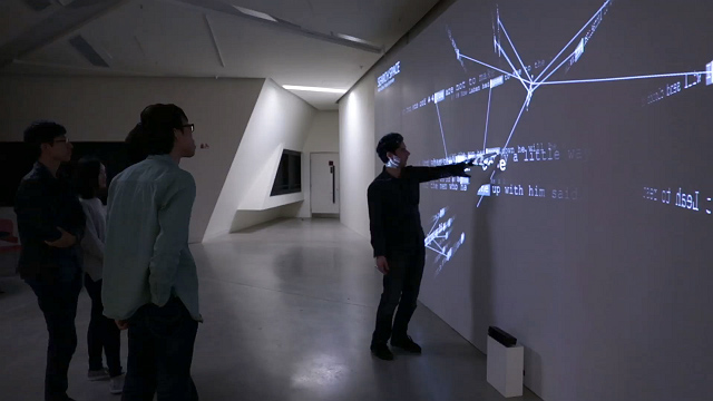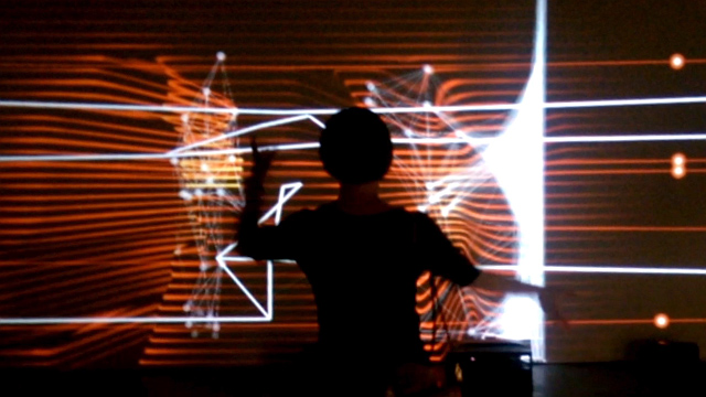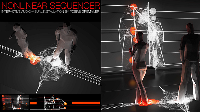 Nonlinear Sequencer is an interactive audiovisual installation. It transforms body gestures into a visualized sound cluster. The space that surrounds the user turns into a musical score. Each movement affects the arrangement score. The installation dissolves the linearity of a musical score into a dynamic structure, shaped by body gestures and movements.
