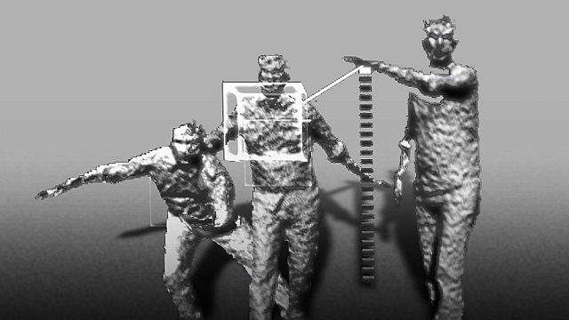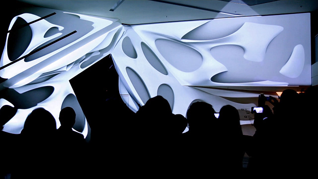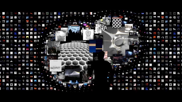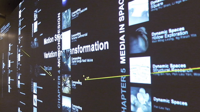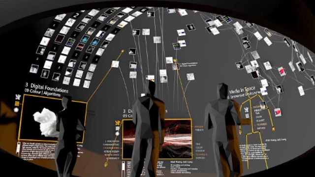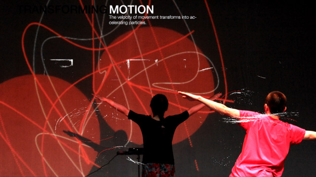The series of exhibitions and studies refers to the human body as a navigational tool for next generation interactive surfaces at the scale of the human body and larger. The employed gesture-based interaction methodologies and the graphical user interface enable multiple users to browse simultaneously within a real space inherited by virtual information objects without the need for additional physical devices (intangible interaction). The project involves a series of interactive studies, developed with the aim of putting the human body in the centre of a rich media environment. It explores the potential of interconnecting human motion with immanent structural features of digital media. By extending the dynamic of human motion into virtual space, the self-awareness of controlling a physical body adapts to a situation-based awareness of controlling and navigating through digital information.