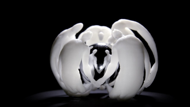 The media of a dancer is the body. Gestures, movements, and expressions are determinated through the consciousness of the physical form. What will happen, if the physical form transforms into a different media, shape, timescale and visual appearance? To control the behaviour of the new Gestalt, the dancer has to transform his own movement likewise. The process of metamorphosis is the core of the six experiments on media and performing arts. Usually, the empty space surrounding the