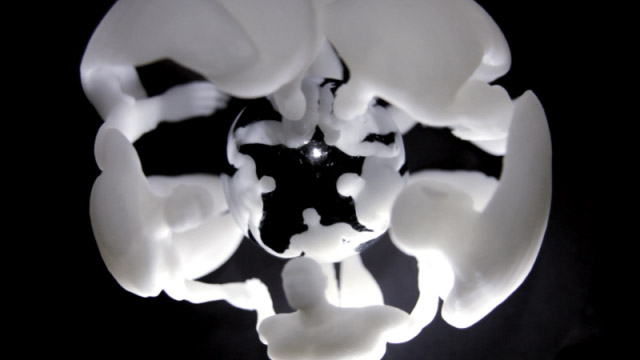 For this study I created an 3D algorithm that deforms a 3d object in a way that it appears undistorted on a curved mirror surface. After printing out the deformed bodies, they look undistorted in the mirrored image onto the metal sphere in the centre.