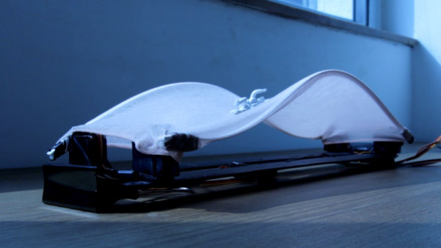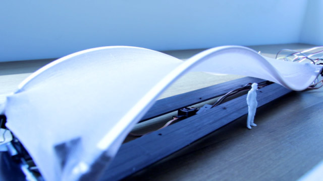 I became interested in dynamic architecture and flexible fabrics. For this experiment, I used four motors to bend two flexible plastic sticks which are connected by a flexible fabric.