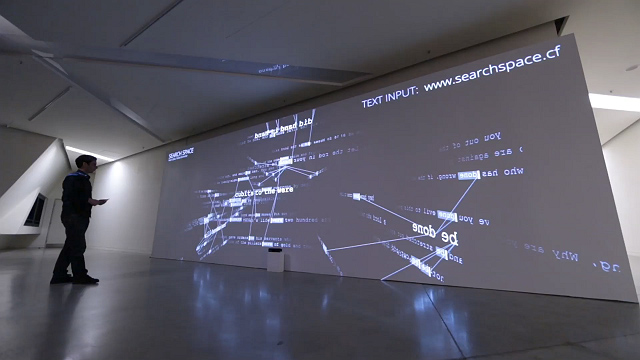 Search Space is an interactive installation that reconstructs text messages by using genetic algorithms. The messages are being processed through a large body of generic text that resonates to search terms. Like a reversed echo chamber, the system gradually alters and adapts to incoming information until the closest possible state is achieved.